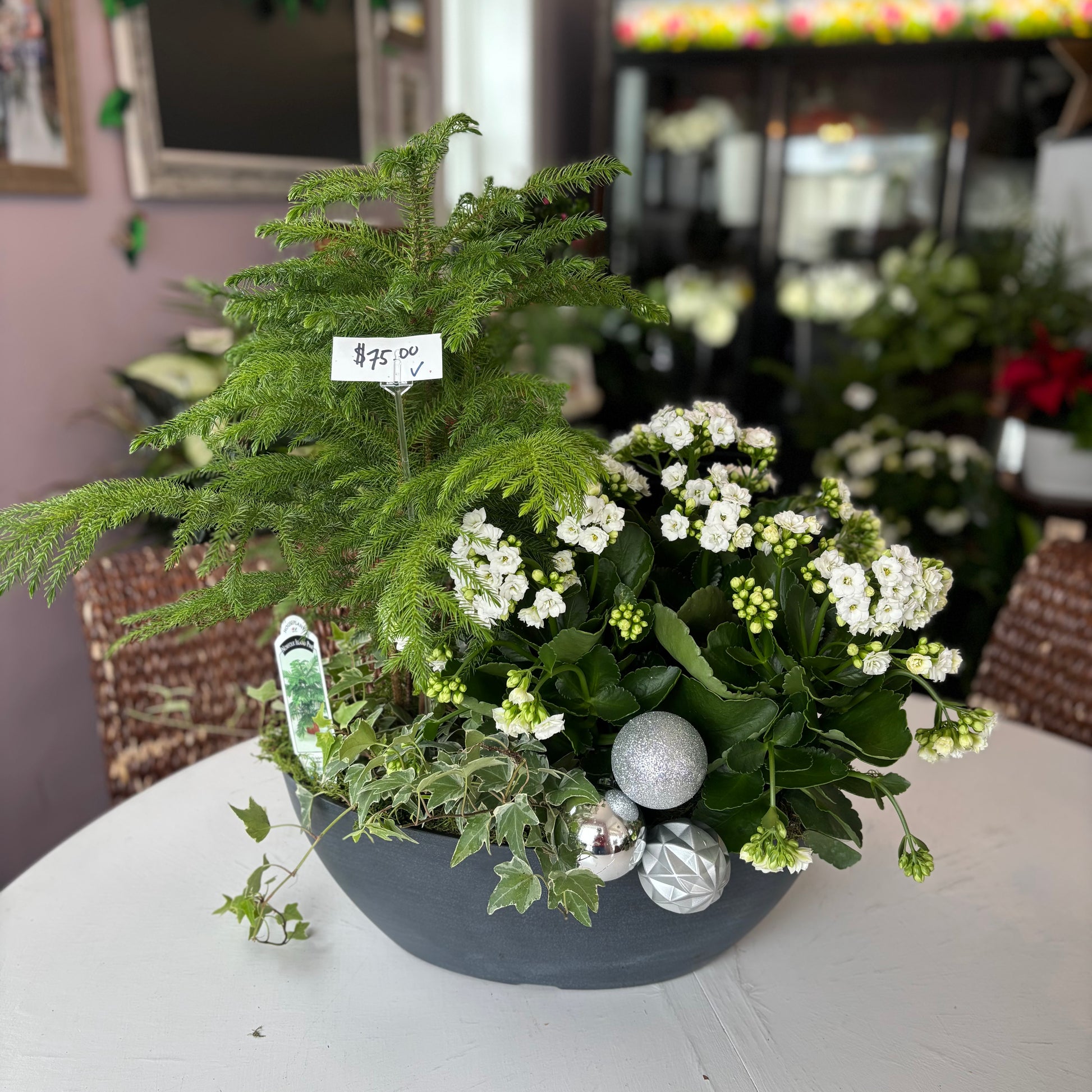 Various indoor plants, including a Norfolk pine and blooming white kalanchoe in a dish.