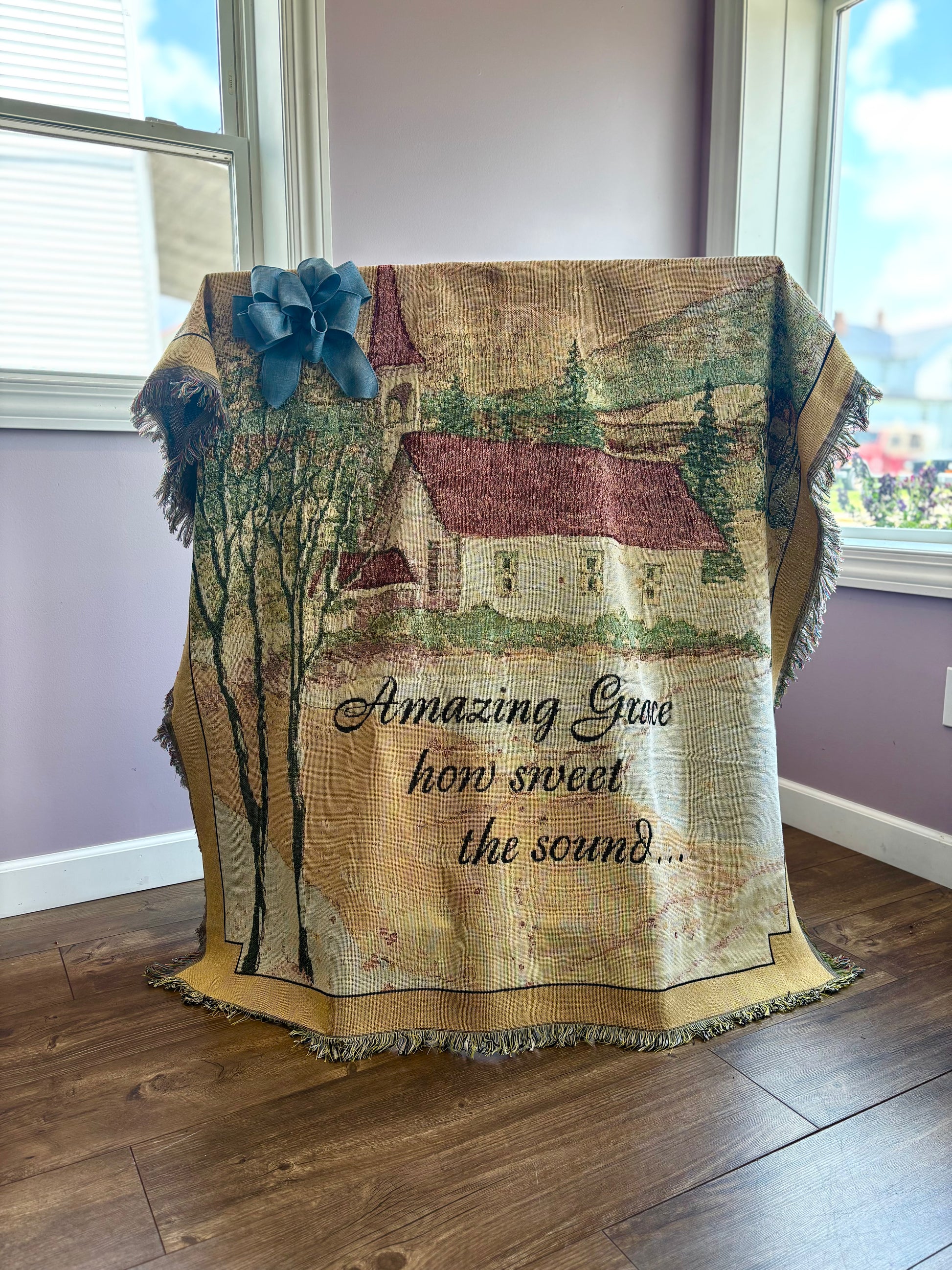 Various messages and images. Please call for options. Price includes afghan and bow.